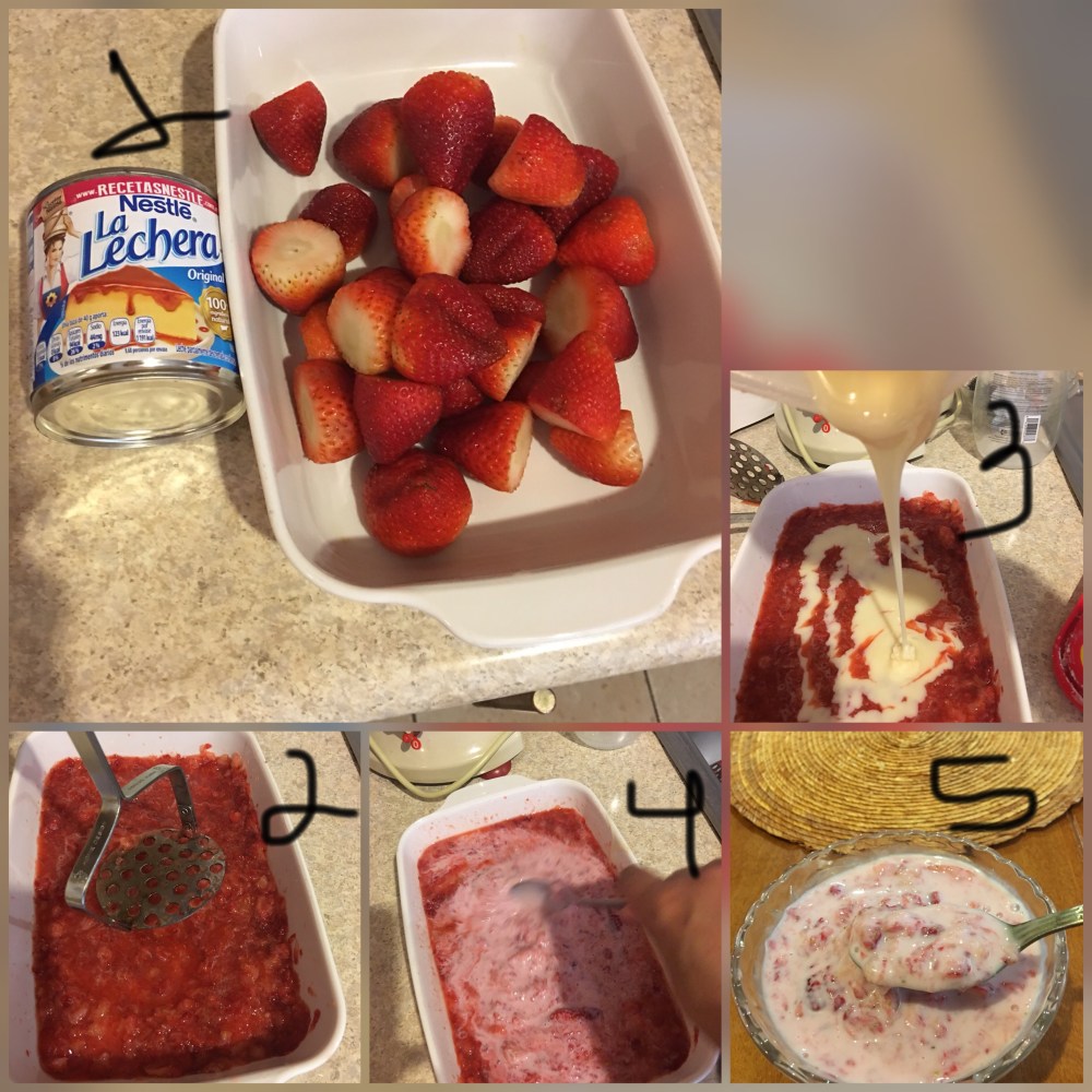 Lavar bien las fresas, ponerlas en un recipiente para poderlas moler, ya bien molidas, echar la lechera al gusto, entre más mejor 😋. (Se vale consentirse de ves en cuando). Revólver y listo. Checa el paso a paso en la imagen.