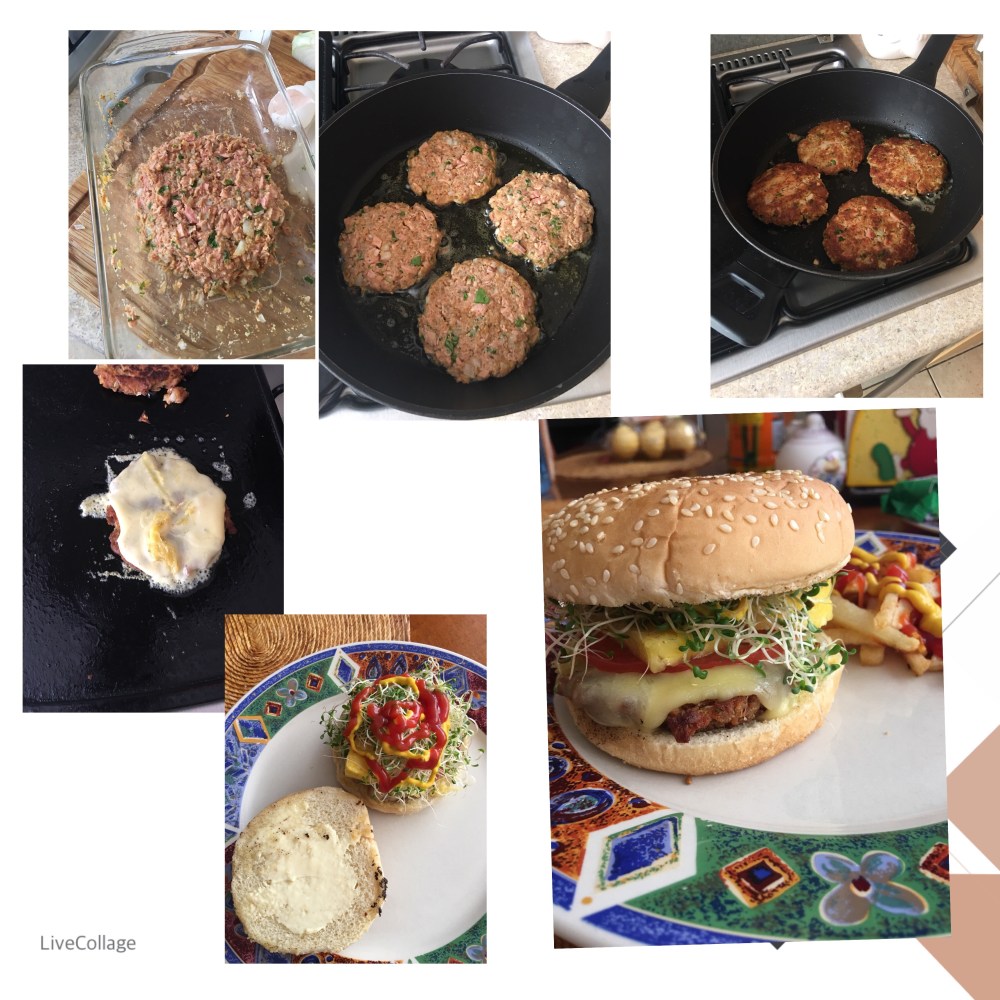 En un bowl, mezclar todos los ingredientes listados en pasta de hamburguesa, batir muy bien, quedará una mezcla espesa, fácil de manipular. Hacer las tortitas con esa masa, del tamaño que gustes, de acuerdo al tamaño del pan que vayas a utilizar. Una vez que se tengan las tortitas se fríen en el aceite de oliva, asegurarse que queden bien cocidas, a fuego medio para que no se quemen.