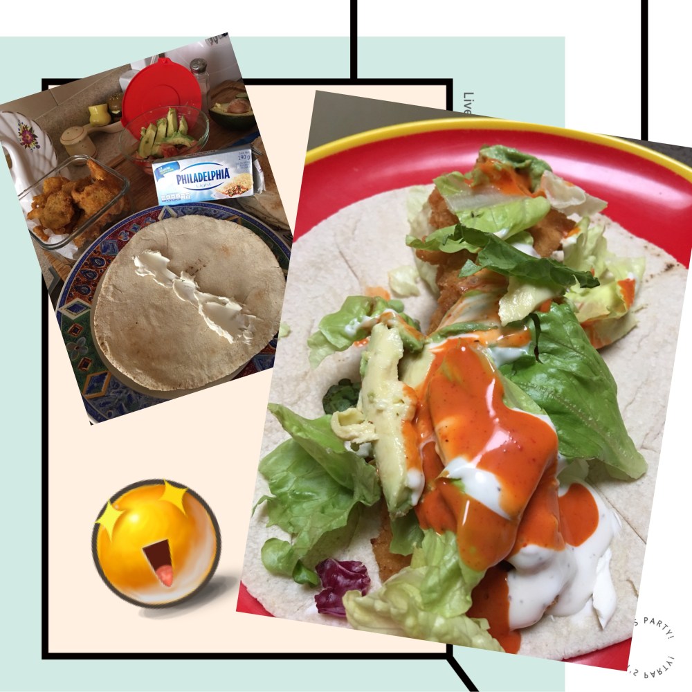 En el pan de pita previamente calentado, untar el queso Philadelphia, poner encima el pollo, la lechuga, el jitomate, el aguacate, el aderezo y la salsa búfalo.