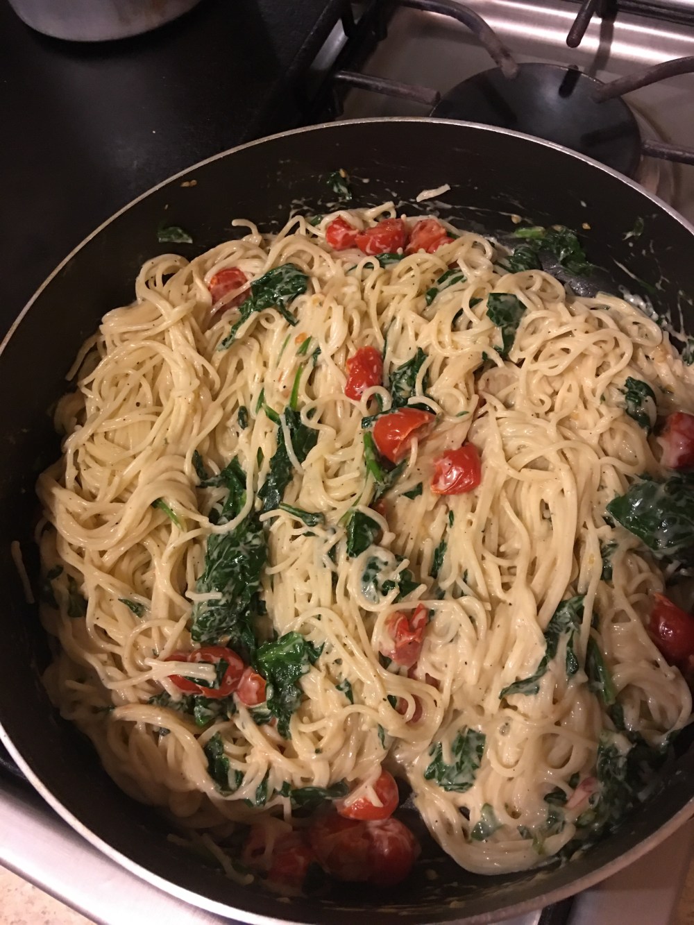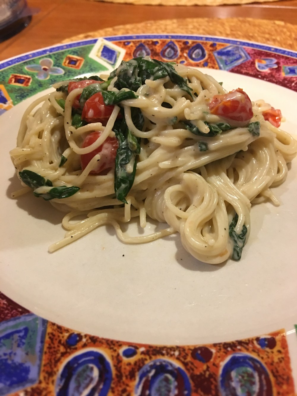 - En un sartén aparte sofreír los tomates y las espinacas con un poco de mantequilla sal y pimienta. Cuando las espinacas reduzcan su volumen ahí ya están listas