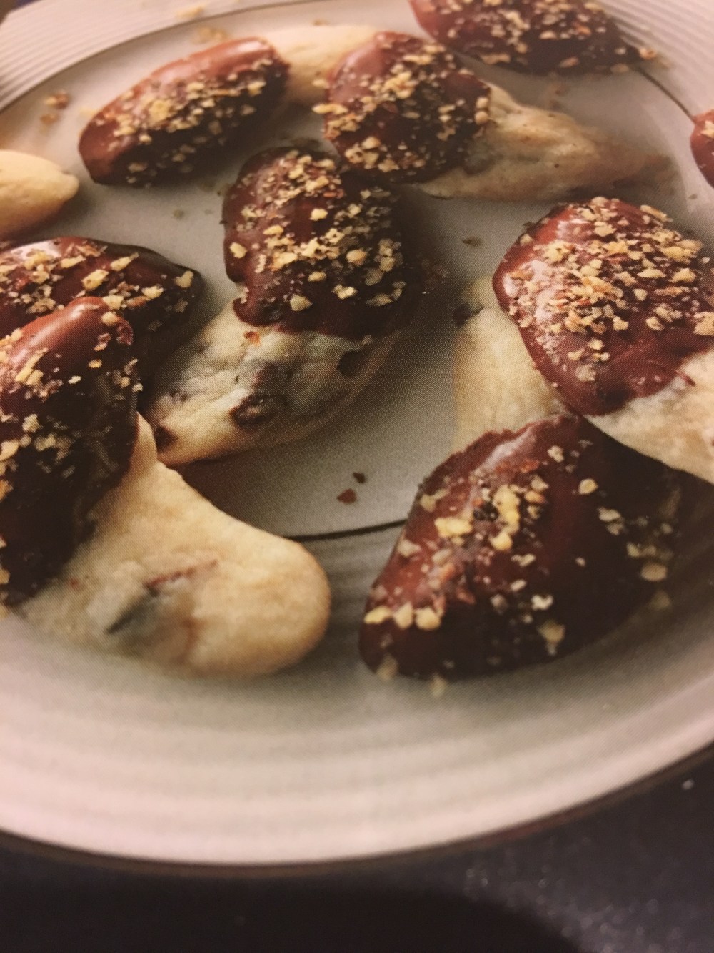 - En un tazón pequeño, derrite las chispas de chocolate y la manteca; revuelve hasta que esté terso. Sumergir la mitad de la galleta en la mezcla de chocolate, escurrir el exceso, esparcir encima la nuez. Poner las galletas a reposar sobre papel encerado y déjalas reposar hasta que se endurezca el chocolate.