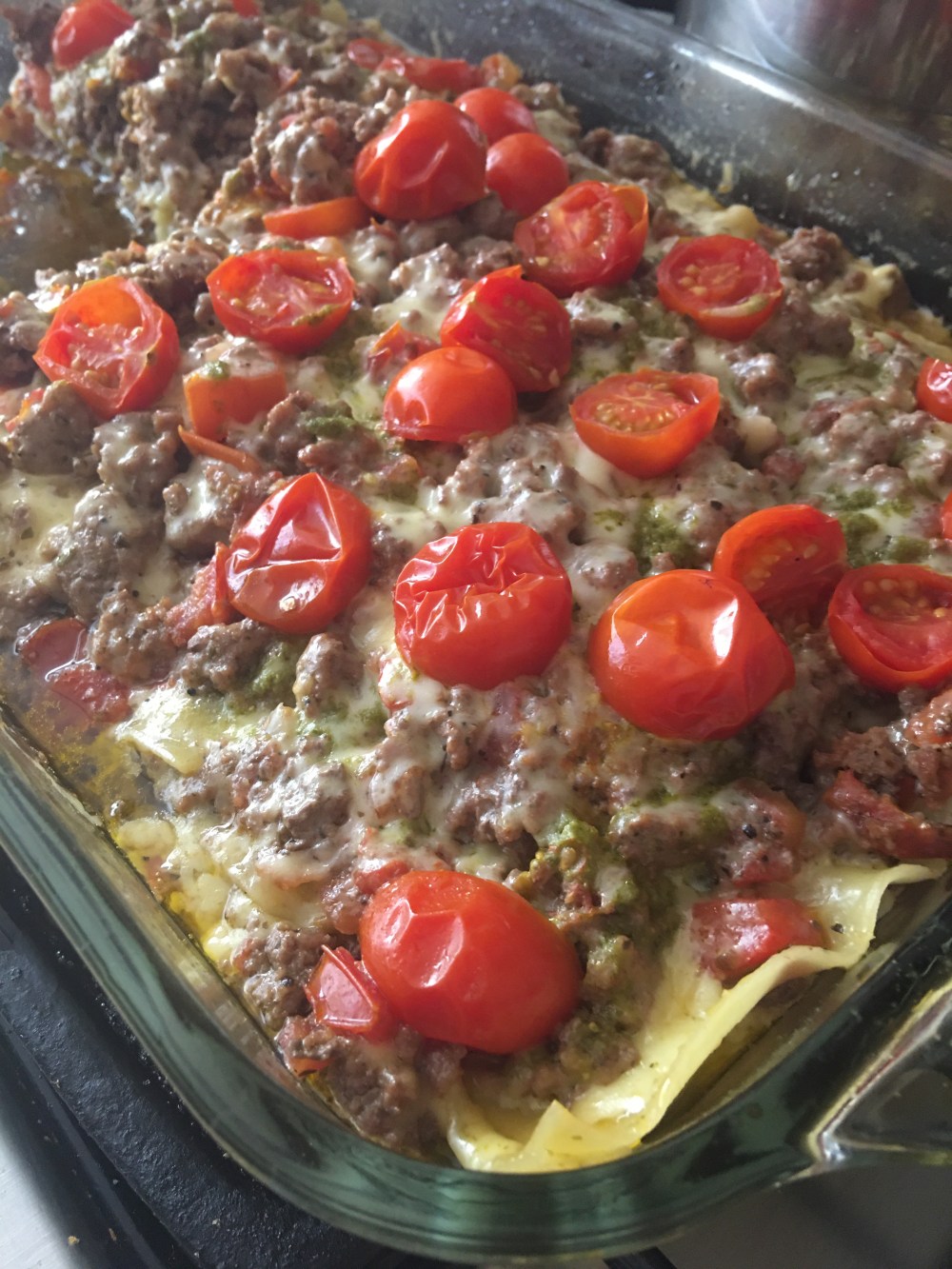 - Cubre un refractario rectangular con el resto de la mantequilla; vierte en el fondo una capa de salsa bechamel, después una capa de la pasta de lasagna, luego la carne sazonada, una capa de queso manchego y un poco de pesto. Repite la operación hasta terminar con los ingredientes.