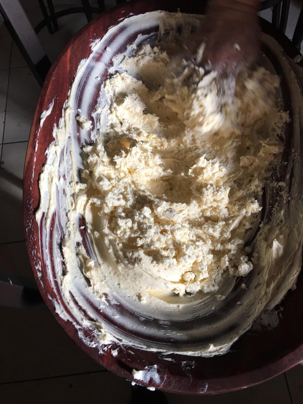 - Batir la mantequilla en un recipiente grande, ya que esté blanda, incorporar la manteca vegetal y seguir batiendo.