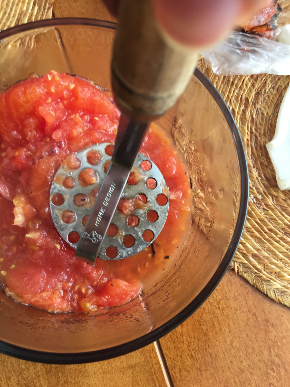 - En un bowl machacar los jitomates, hasta que queden bien molidos.