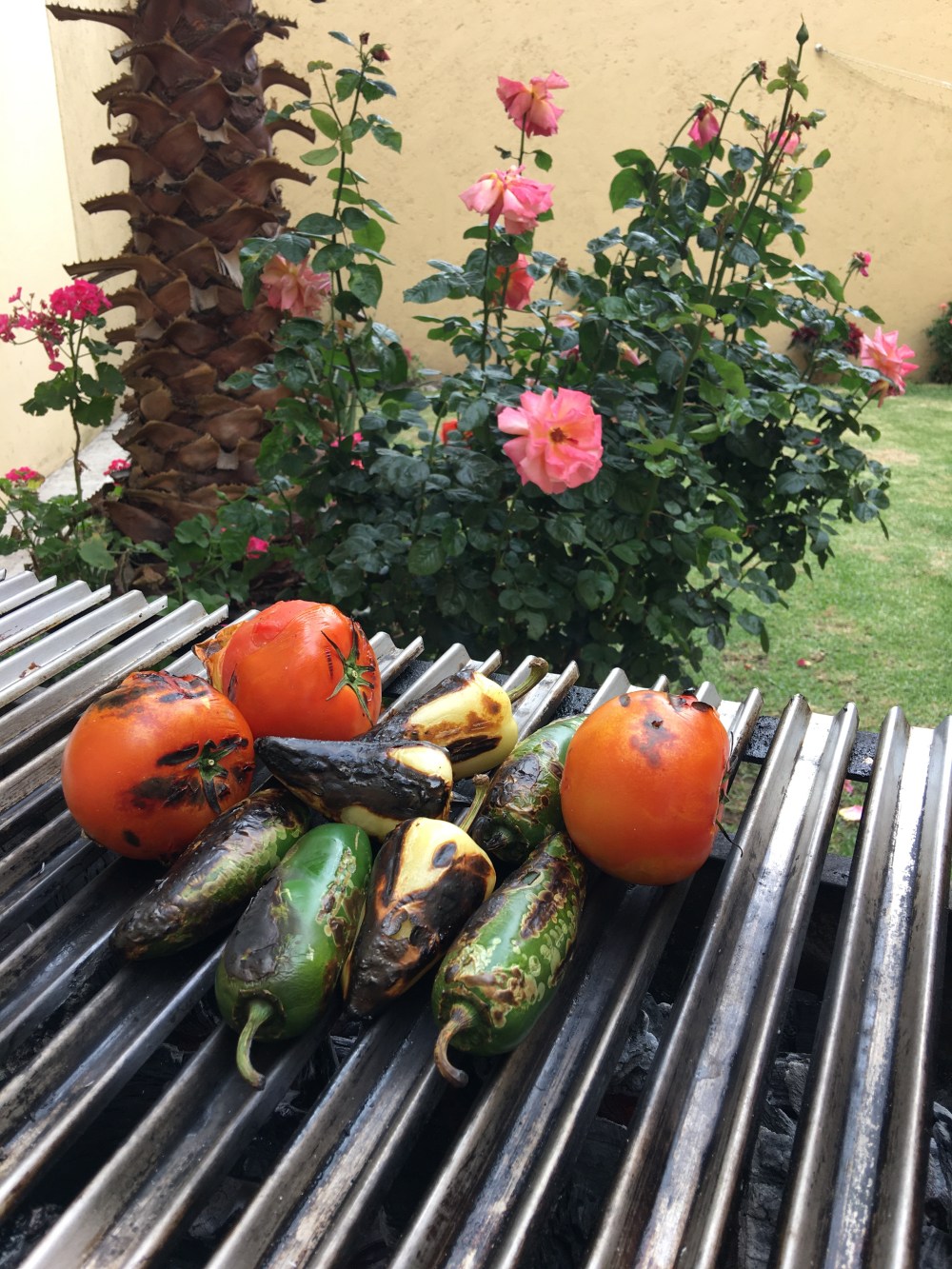 - Poner a tatemar los chiles y los jitomates al carbón o en la estufa. Yo los hice al carbón.