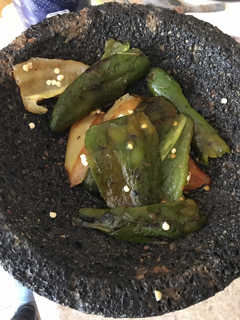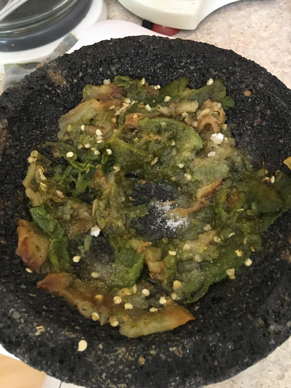 - Después de que hayan pasado unos 15 minutos, pelarlos y desvenarlos. Agregarlos al molcajete para machacarlos poco a poco.