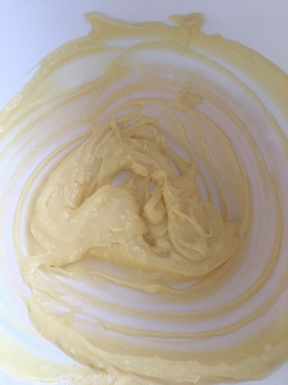 - En otro recipiente poner la mantequilla y empezar a batir hasta que quede cremosa, agregar el azúcar glas 1/3 de taza, que quede bien mezclado.