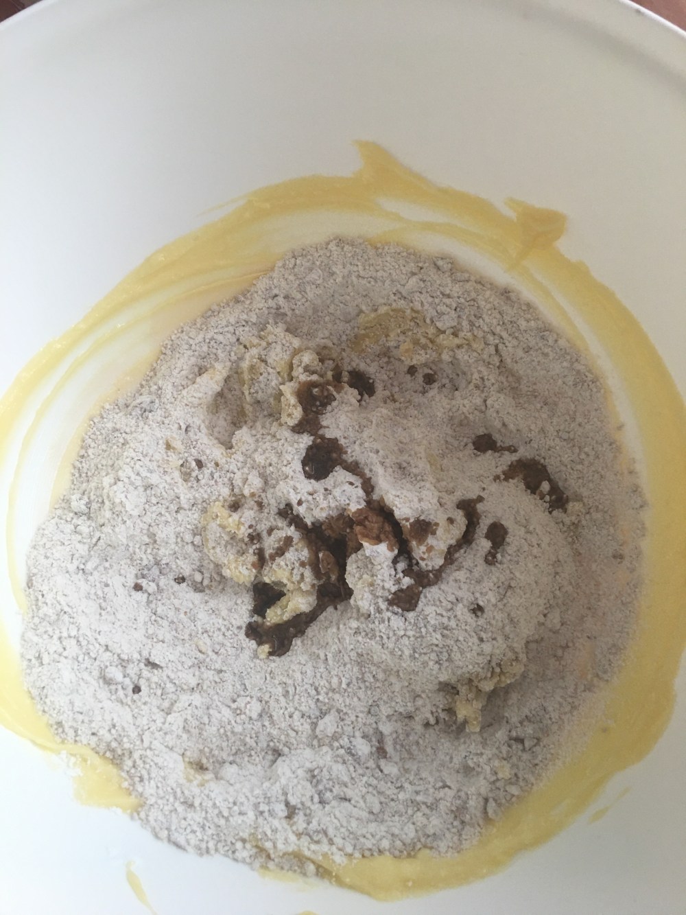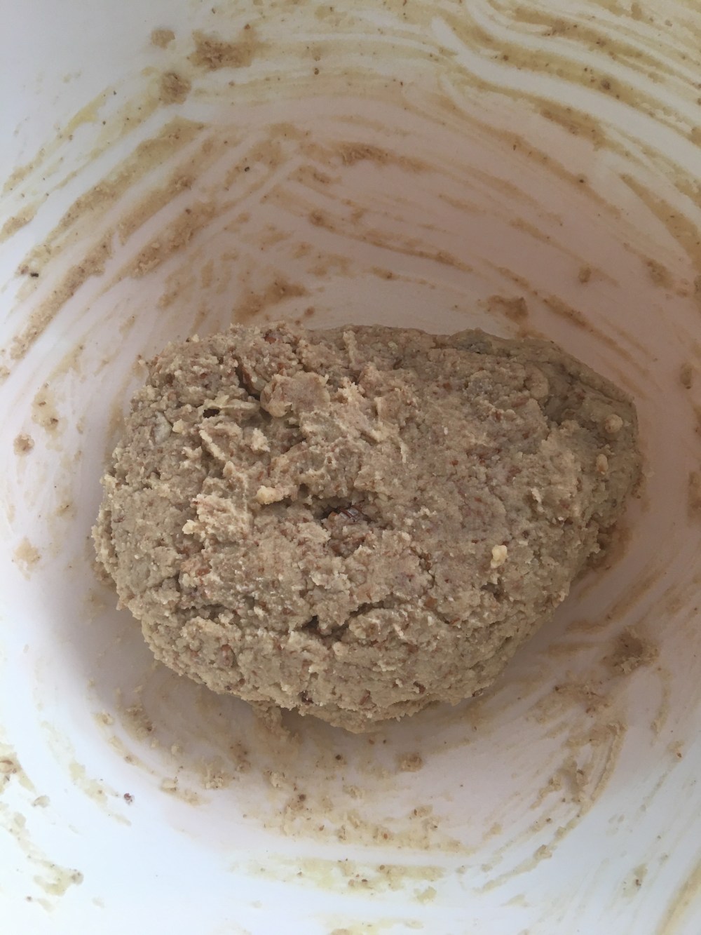 - Seguir batiendo hasta que tengamos la mezcla lista, la consistencia será pastosa y está bien, es por la nuez que agregamos.