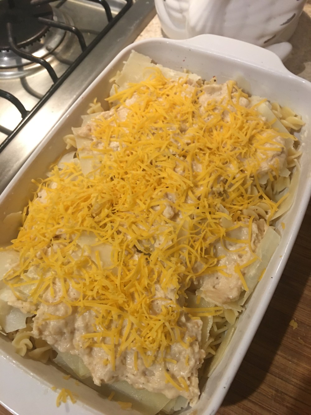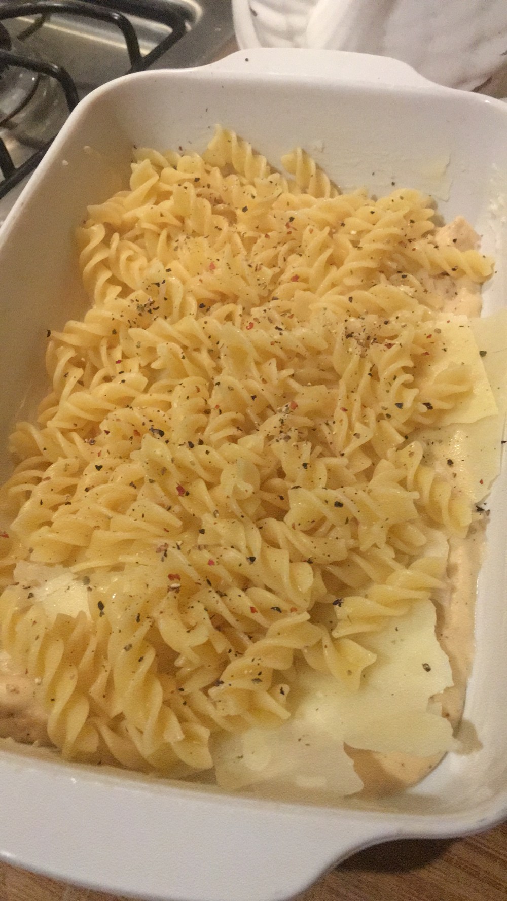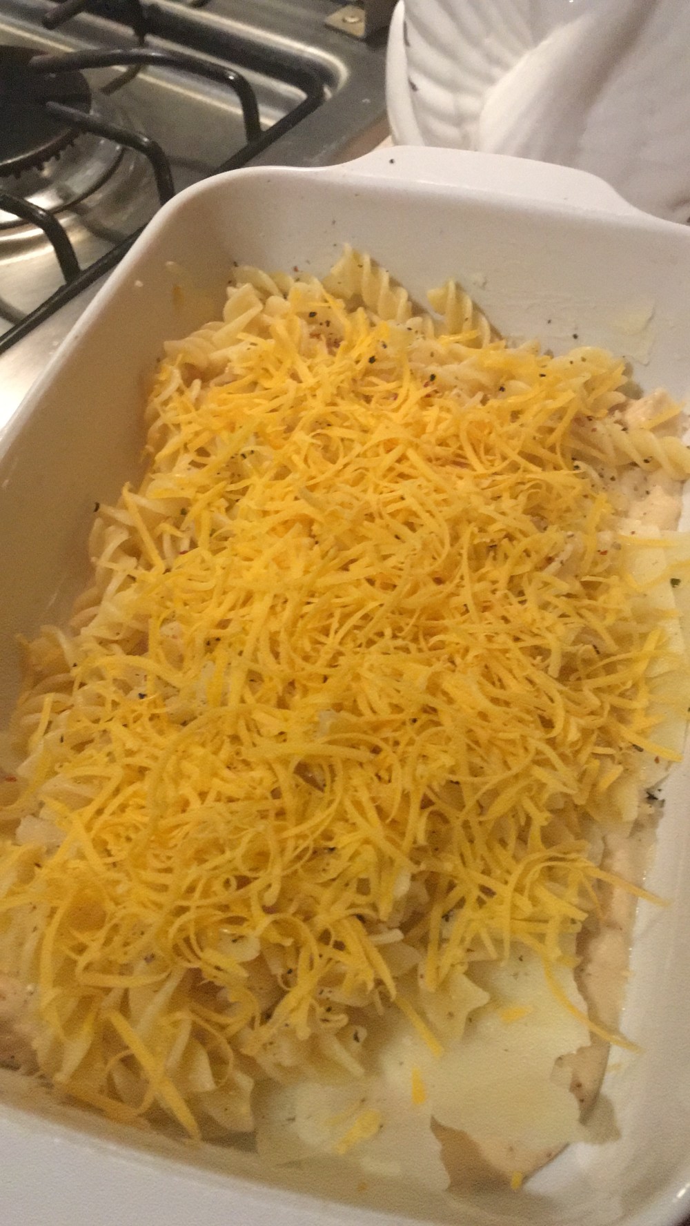- Hacer otra capa, agregar pasta, luego queso parmesano y chedar también junto con un poco de pimienta.