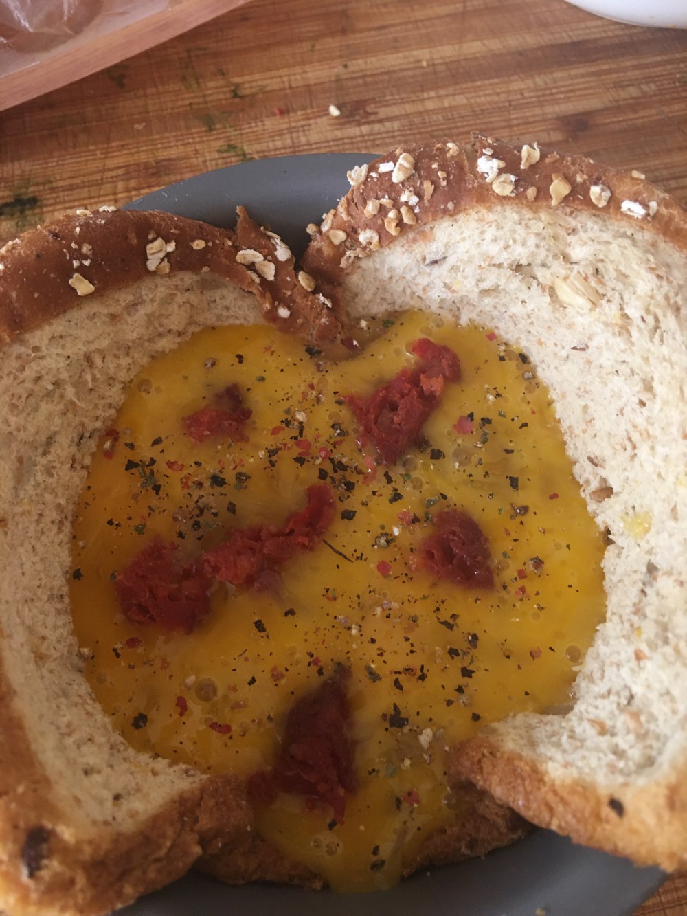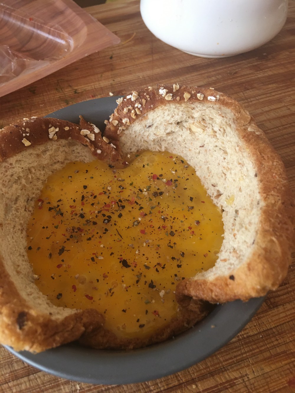 - Batir el huevo en una taza y luego agregarlo al molde, poner sal y pimienta encima
