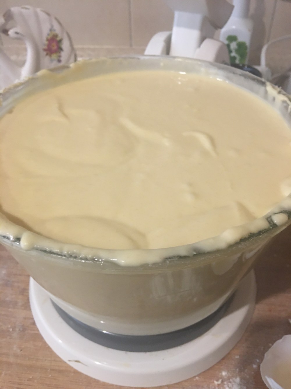 - Batir la mantequilla, que esté a temperatura ambiente, ya cremosa, agregar la nata y seguir batiendo.