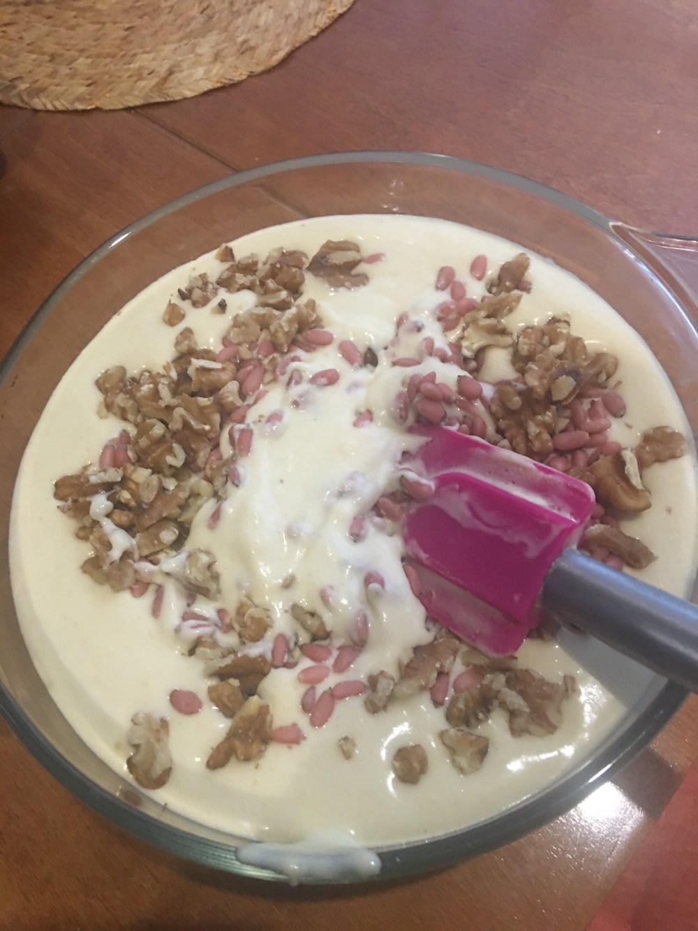 - En el primero mezclaremos, nueces y piñoñes, revolver y agregar al molde enharinado.