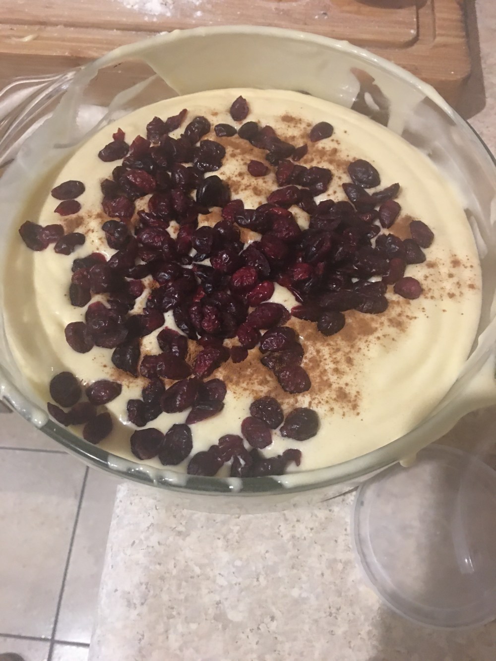 - En el siguiente agregar canela y arándanos. Revolver y agregar al molde.